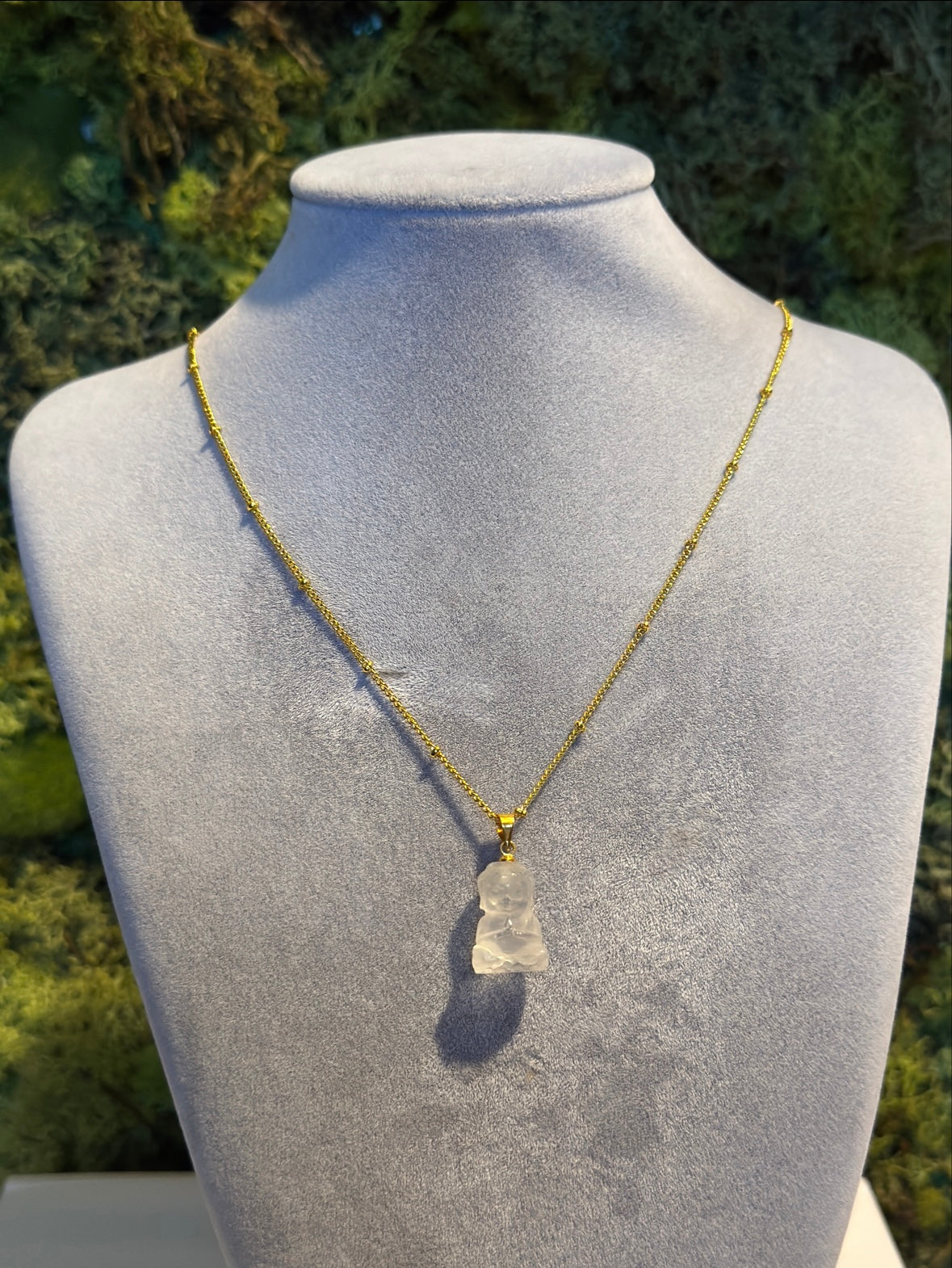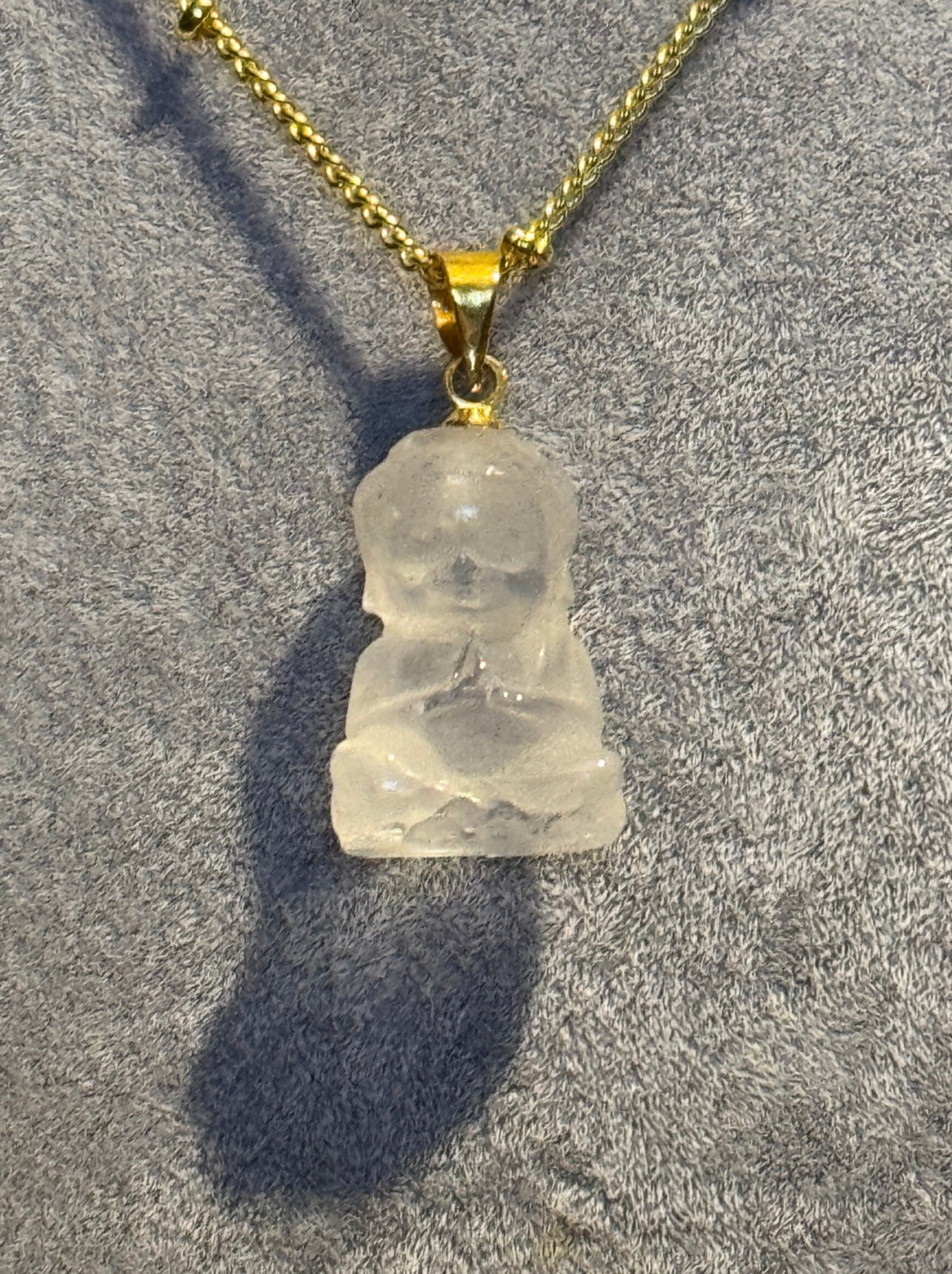 Dieser Bergkristall-Anhänger in Buddha-Form wird in der Alternativmedizin traditionell zur Harmonisierung von Körper und Geist verwendet.